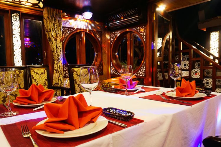 19.00 – 20.30 Hòa mình trong không gian ấm cúng lãng mạn tại nhà hàng – thưởng thức những đặc sản tươi ngon do chính đầu bếp trên tàu thực hiện
